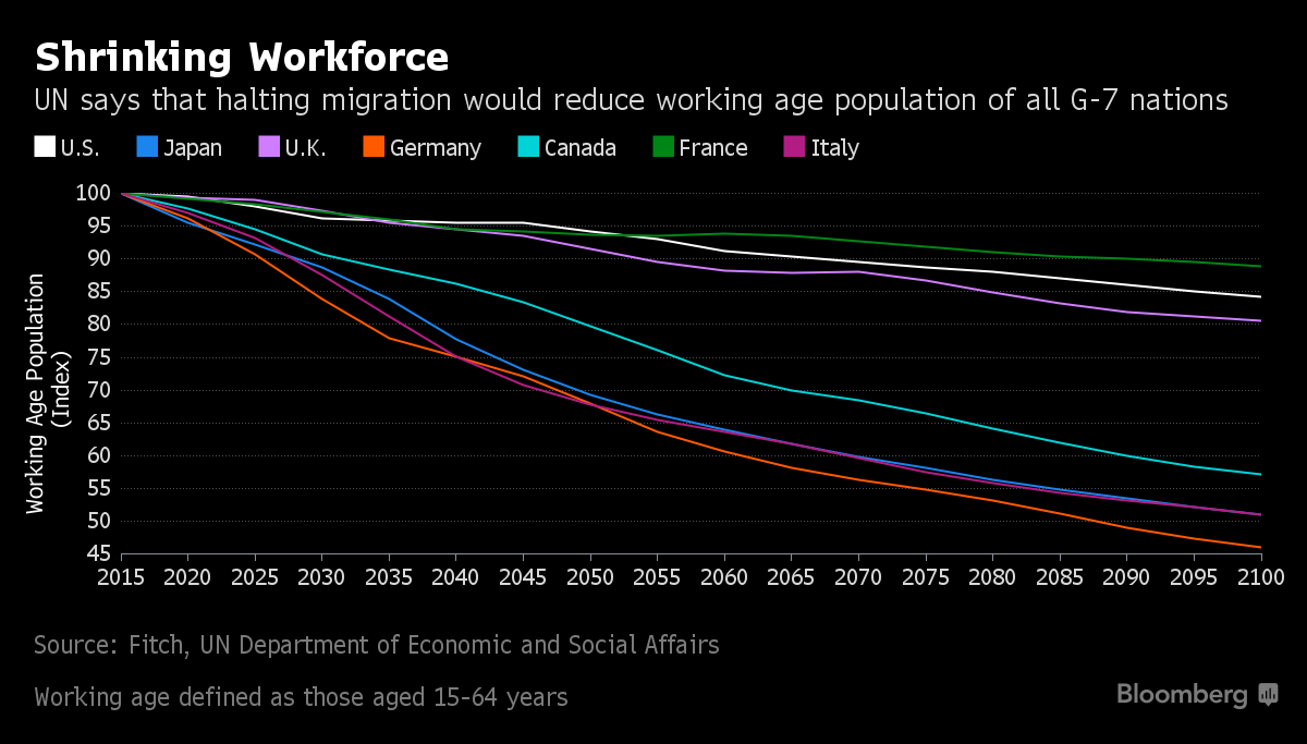 Analysis of United Nations data by Fitch Ratings shows halting immigration would drastically reduce the potential working population of Group-of-Seven nations, leaving aging societies more dependent on a smaller labor force and resulting in greater financial stress on pension systems and potentially slower growth.